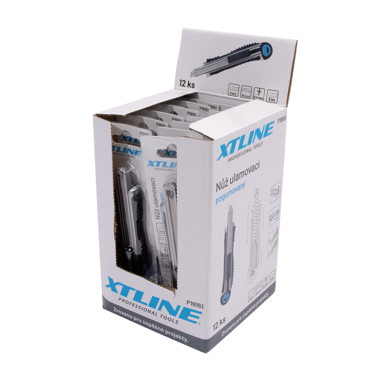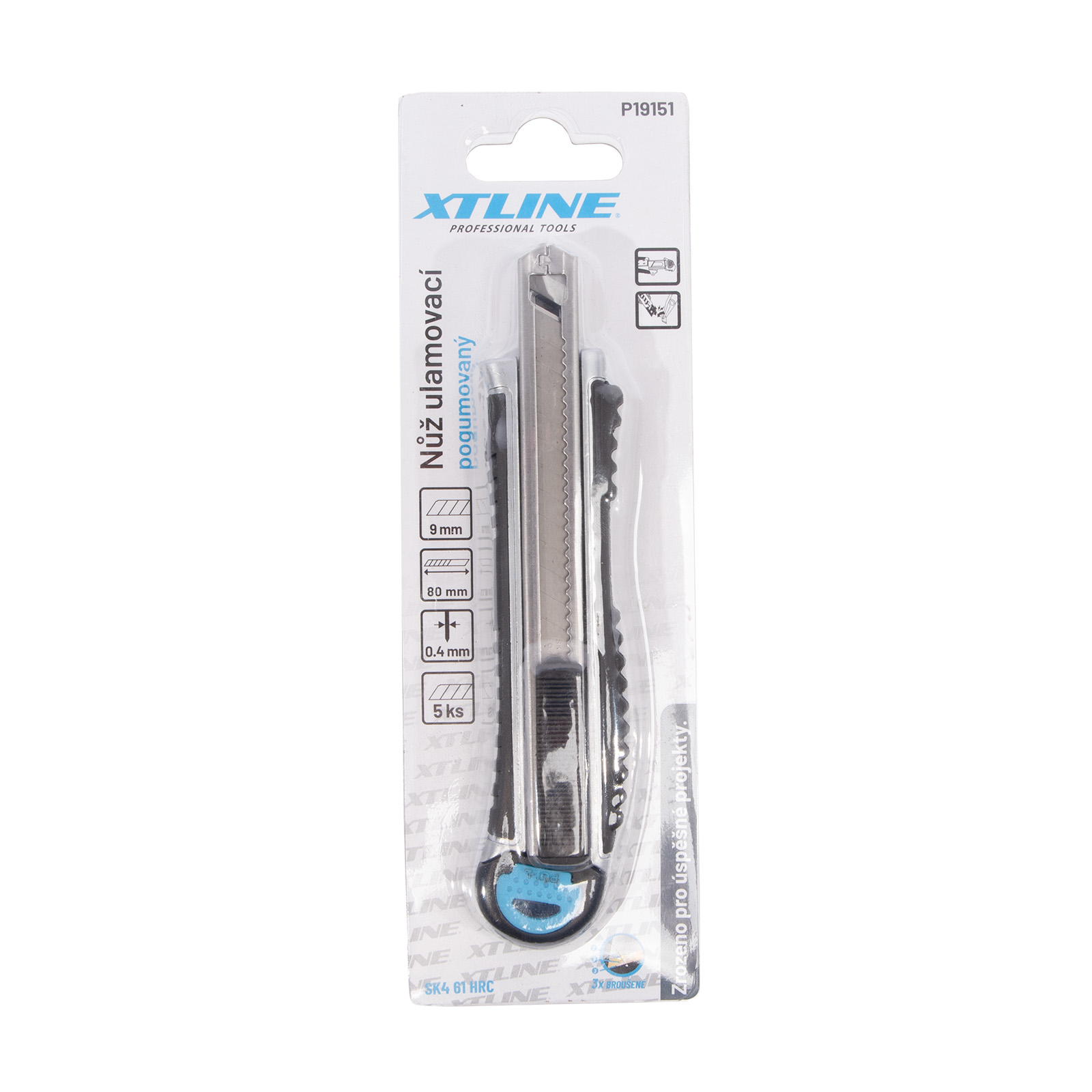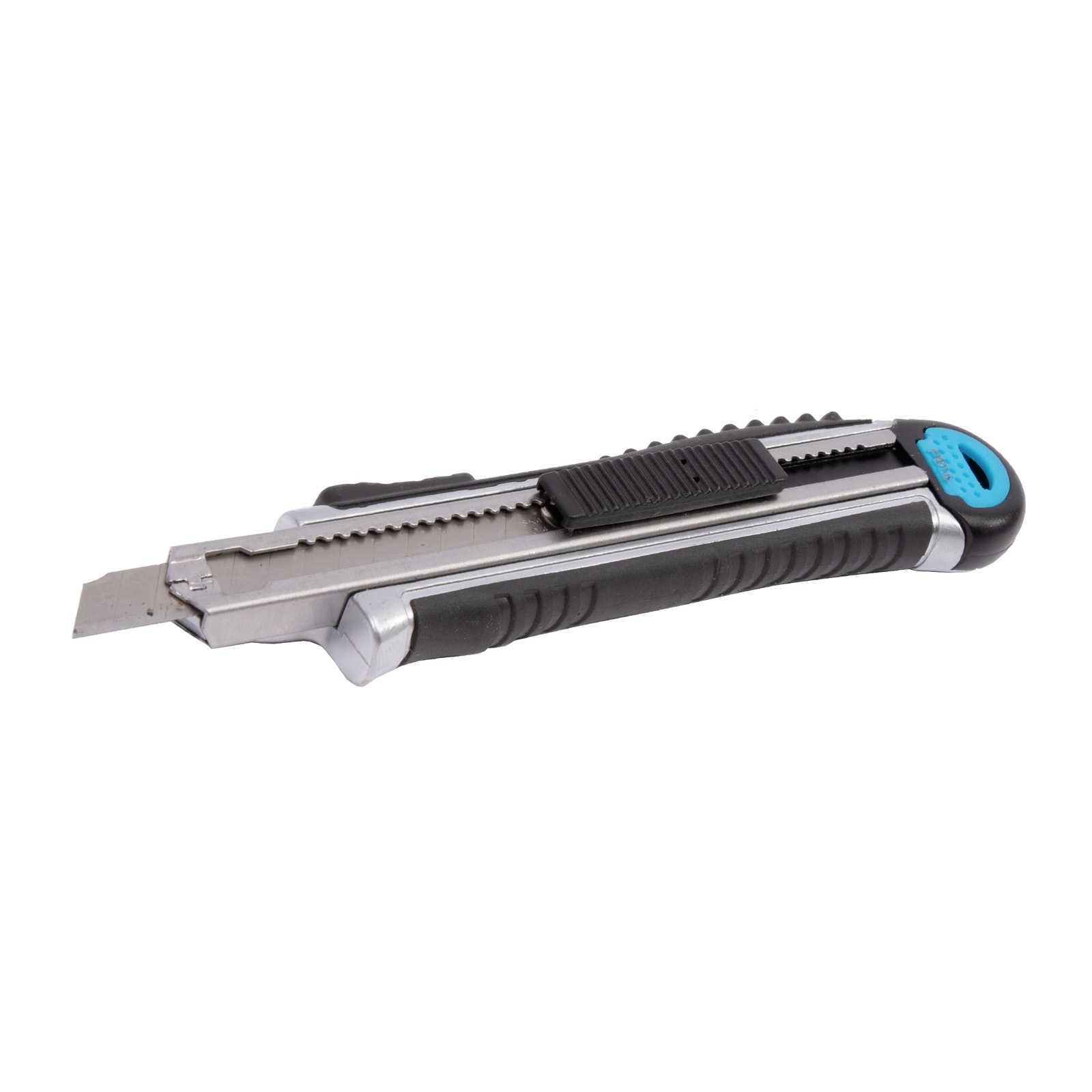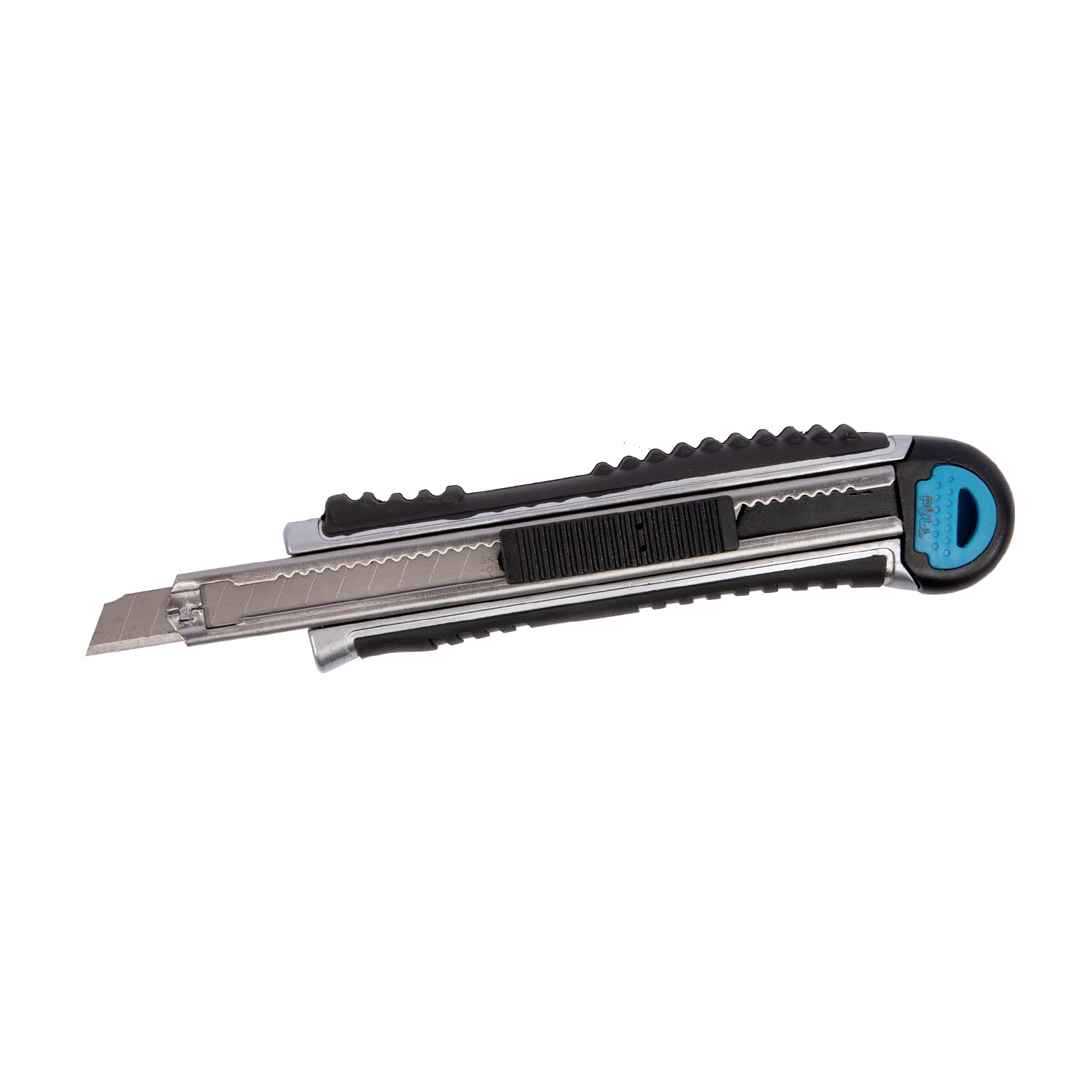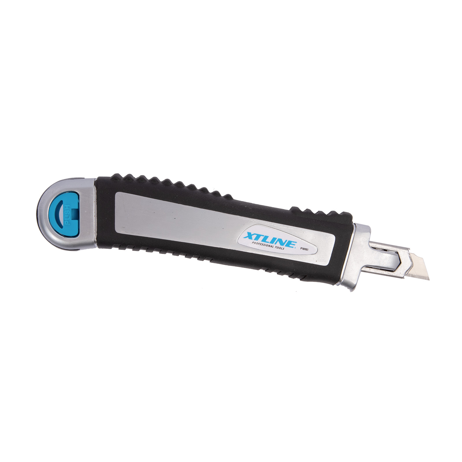 Celokovový odlamovací nôž s kovovou vodiacou lištou a gumovým plášťom. Oceľové vodítko čepele sa vždy automaticky uzamkne proti pohybu a umožňuje rýchlu výmenu náhradné čepele priamo zo zásobníku.Pogumovaná rukoväť s drážkami proti preklzu, vysúvací slúži ako zámok a k rýchlej výmene britu. Vysúvací zásobník s 5ti náhradnými čepeľami.