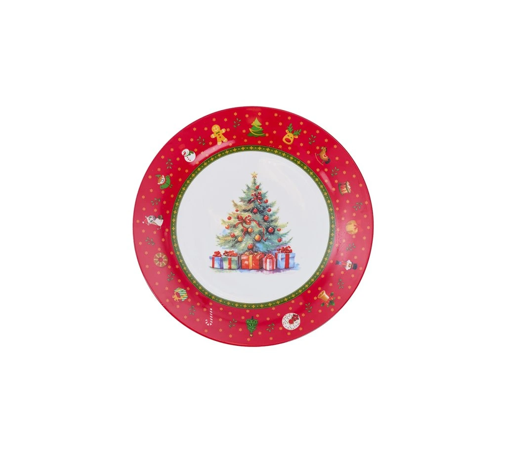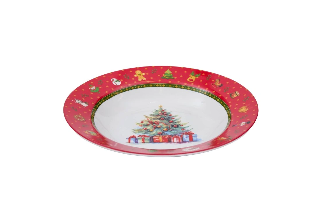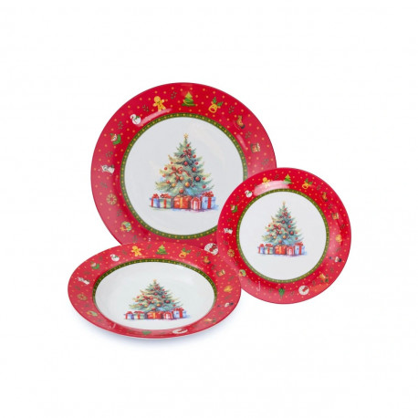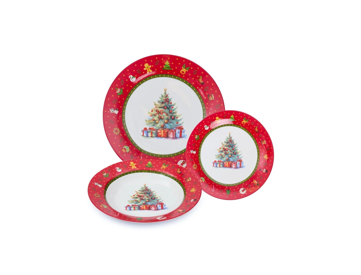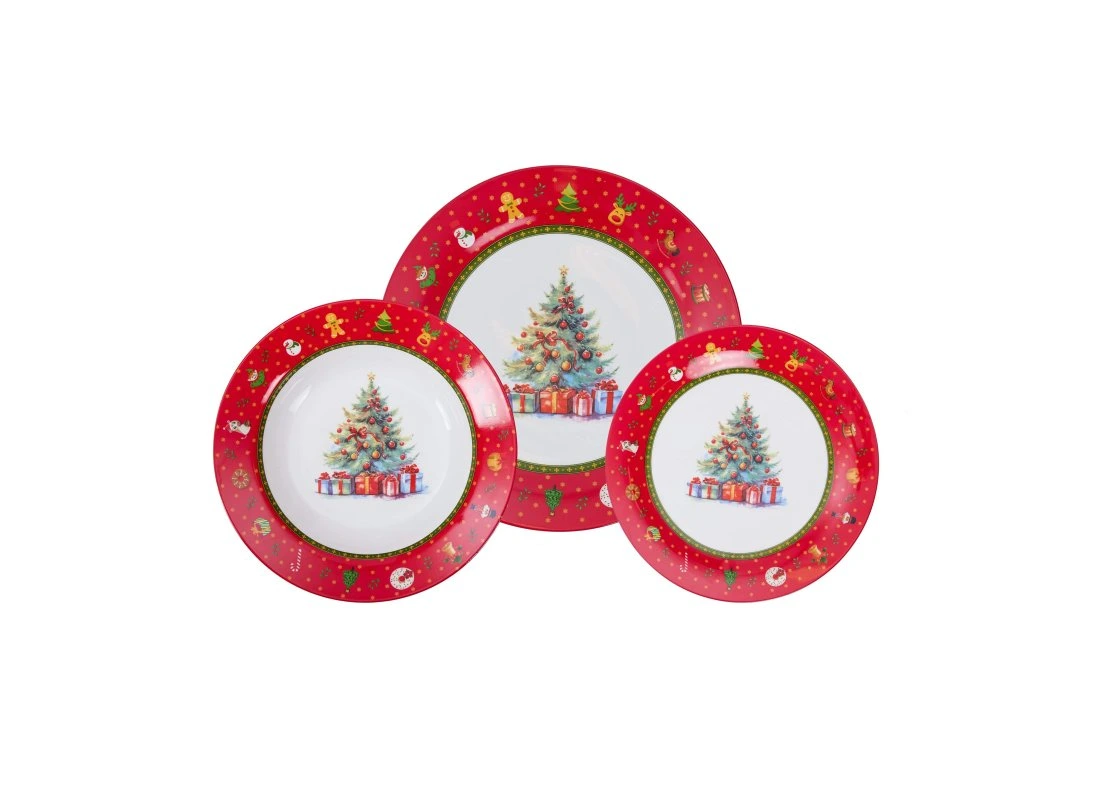 Set vianočných tanierov obsahuje plytký malý tanier, plytký veľký tanier a hlboký tanier. S každého typu tanierov po šesť kusov, spolu 18 kusov tanierov.