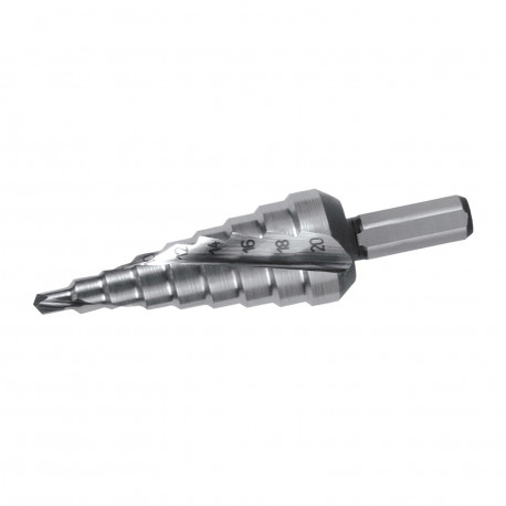 Stupňovité vrtáky HSS sú brúsené metódou CBN, špirálovite drážkované s krížovým brúsením. Úprava priečneho britu je podľa DIN 1412 C. Tento hĺbkovo brúsený a šróbovitý rozpínak ponúka absolútne kľudné výkony v behu a vysoký výkon britov. Obzvlášť nezlomné triesky sa pri tomto šróbovitom vrtáku odstránia veľmi jednoducho. Toto zmenšuje tvorenie nárastkov na brite a studené zváranie na týchto britoch. Konus uľahčuje vyťahovanie vrtákov naspäť pri prevŕtaní kovu.